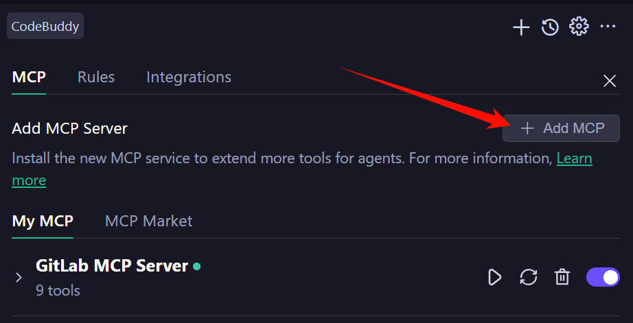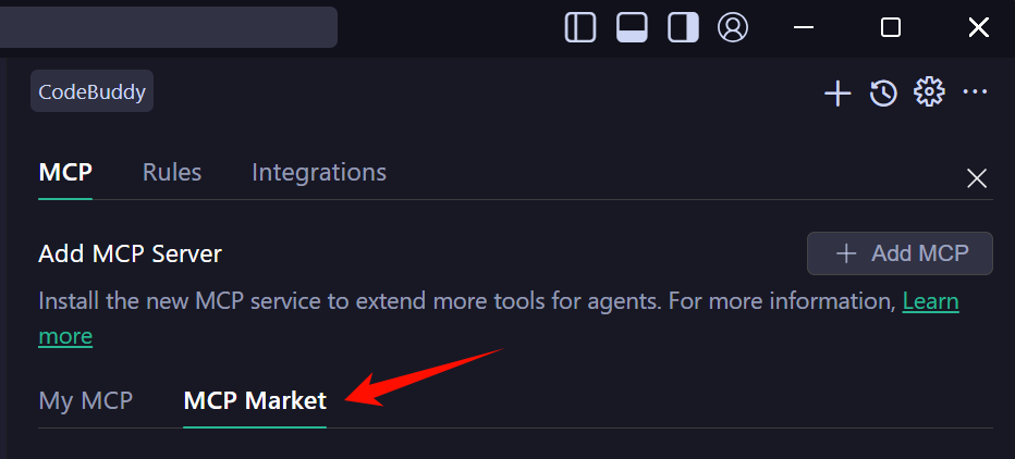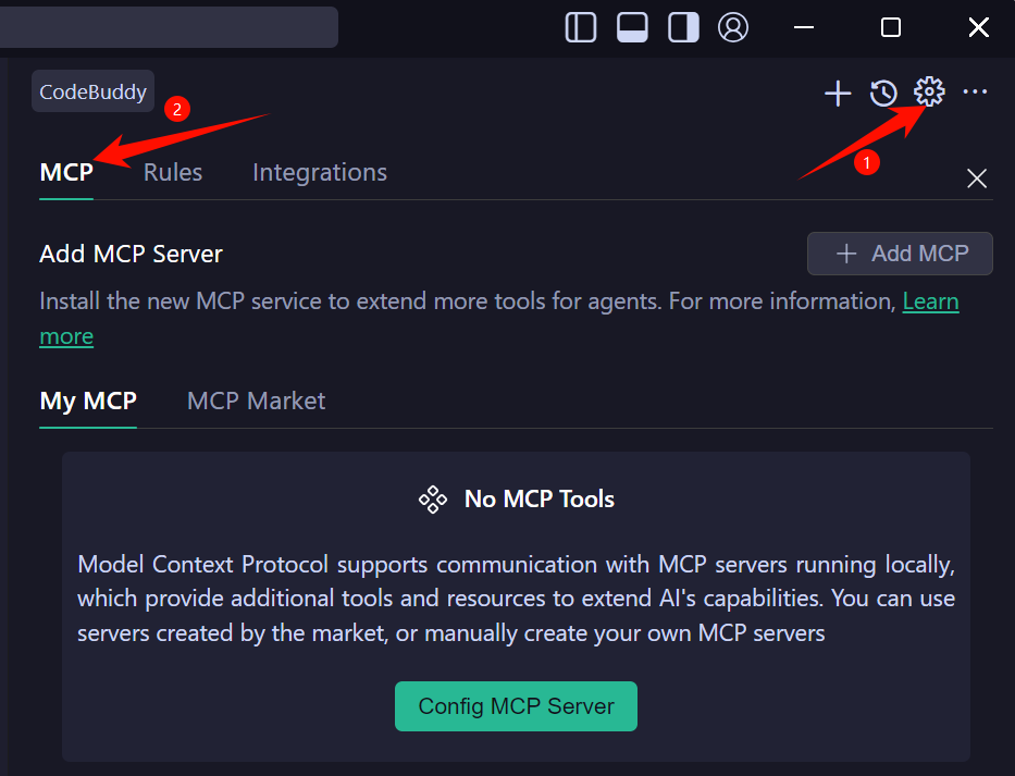 In the top-right corner of the sidebar conversation panel, click CodeBuddy Settings, then switch to the MCP tab.
