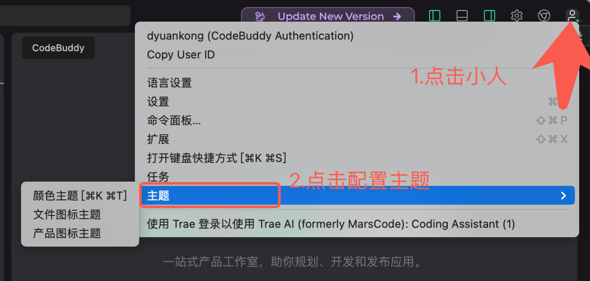 Click on Theme, select Configure Theme. Available theme options include Color Theme, File Icon Theme, and Product Icon Theme.
