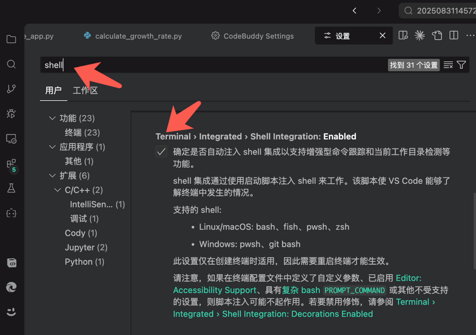 The error is as follows, indicating that the shell integration switch needs to be set to Enable.
