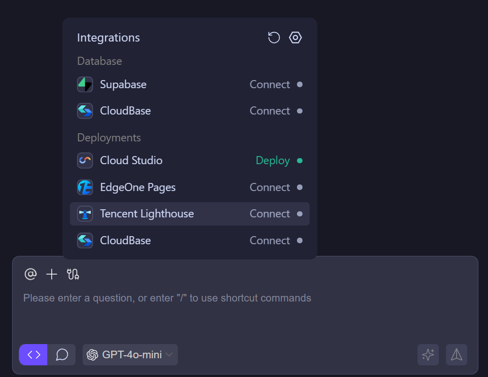 - In the toolbar above the conversation panel, click the Integrations button, then click the Connect button next to Tencent Lighthouse in the list to start the connection.