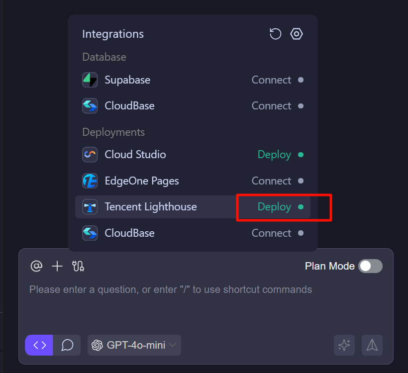 In the toolbar above the conversation panel, click Deploy next to Tencent Lighthouse in the Integrations list to trigger deployment.