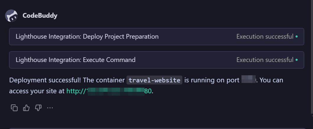 After triggering deployment, Agent will automatically analyze the current project, check and install the environment on the target Lighthouse instance, package the project, transfer files, deploy, and start the application, among other automated deployment tasks.