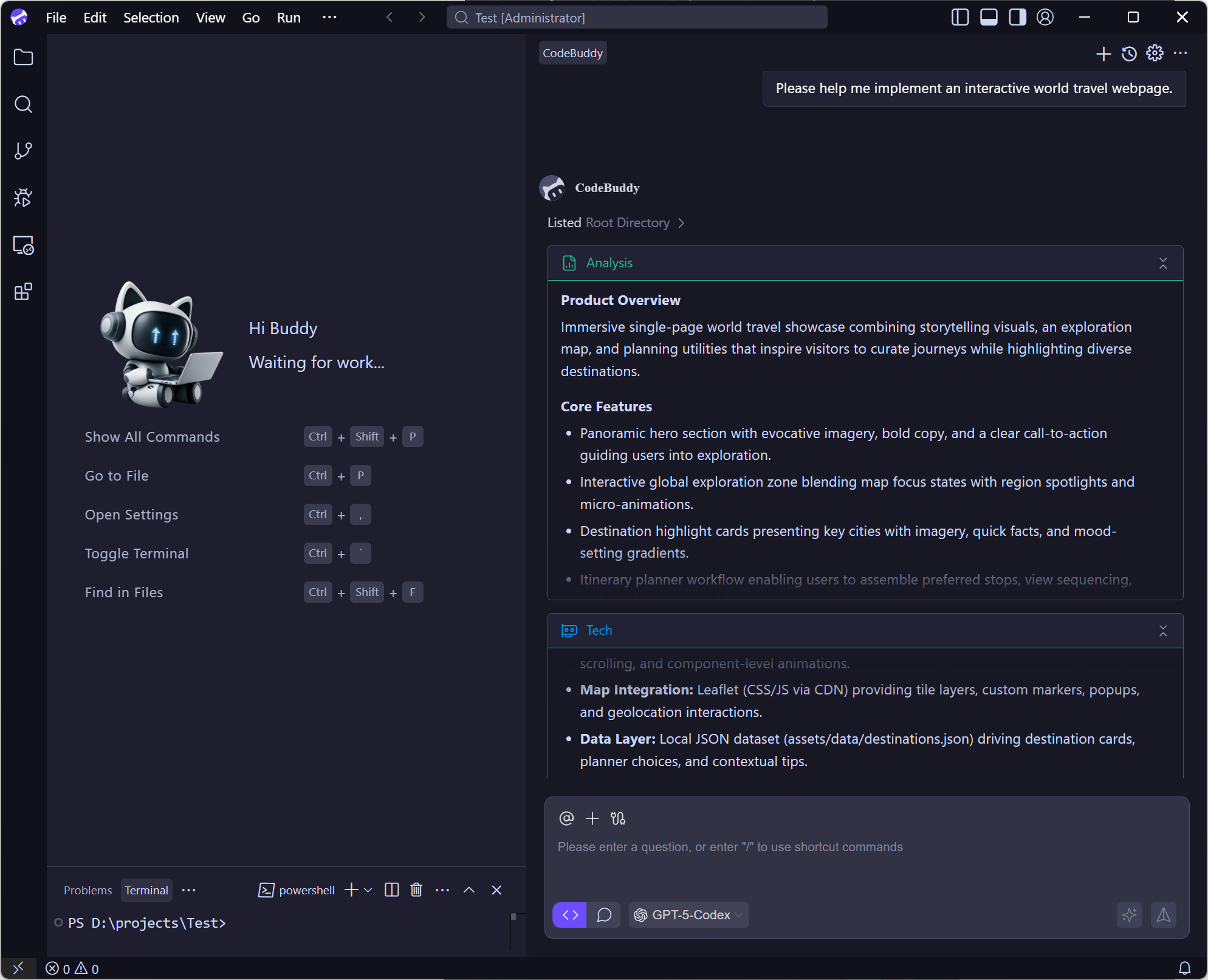 After enabling Plan Mode, input the same requirement description and send it to the AI. As shown below, when Plan Mode is enabled, CodeBuddy IDE first analyzes and understands the input requirement, breaks down the task into detailed technical stacks and web design implementation, and finally generates the requirement document (PRD).