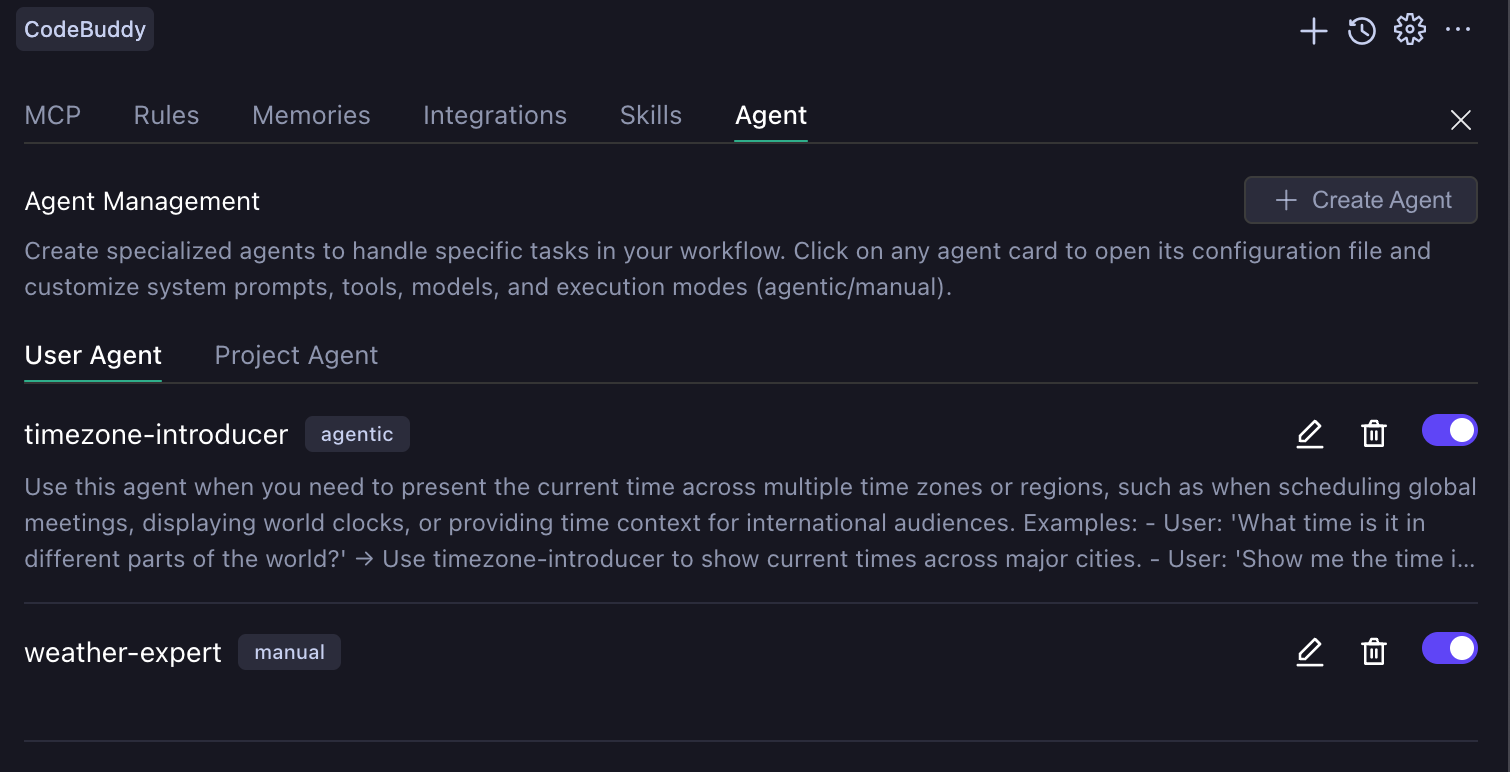 CodeBuddy IDE supports two modes: agentic and manual, both displayed after the Subagent name in the settings page.