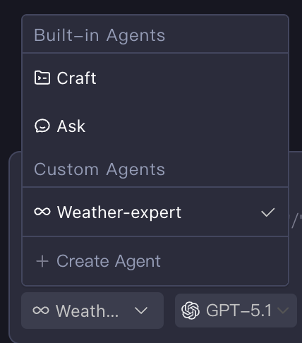 The main Agent (Craft Agent) automatically determines when to invoke, with an independent context window that doesn't pollute the main session. Note that Subagent invocation in this mode cannot be interrupted midway. When an agentic Subagent is triggered, there are only two outcomes: either wait for the Subagent to complete the task and return results to the main Agent (Craft Agent), or manually interrupt the current conversation.