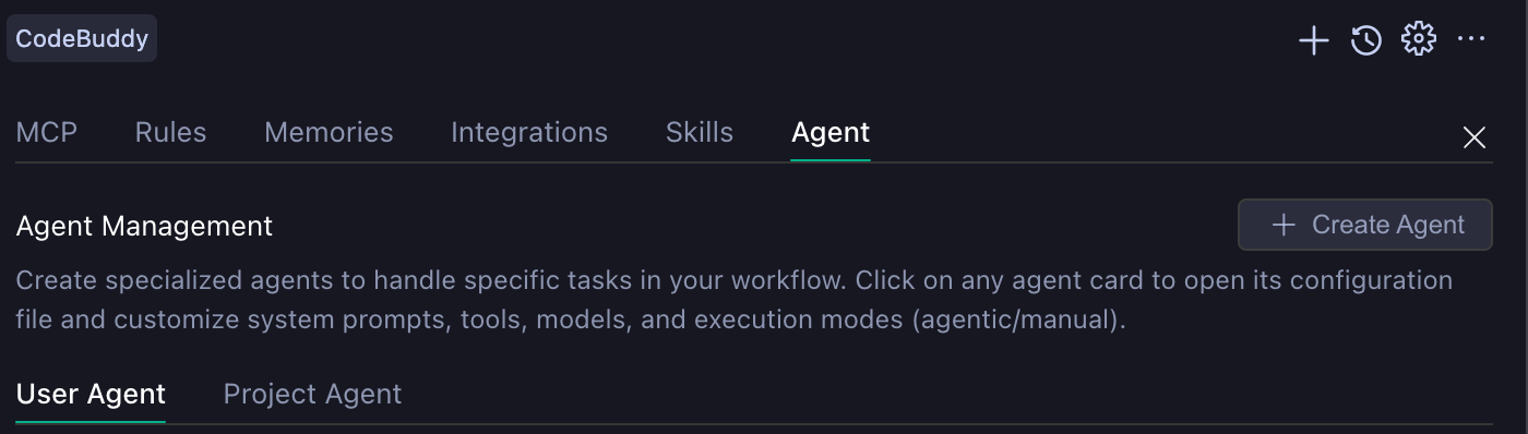 Subagents are stored locally as Markdown files. You can also create files at the corresponding path to configure Subagents, but in IDE, it's recommended to use the Create Agent button in the Agent Tab of the settings page to create Subagents with different modes. When clicking the button with User Agent Tab selected, a user-level Subagent will be created; otherwise, a project-level Subagent will be created.