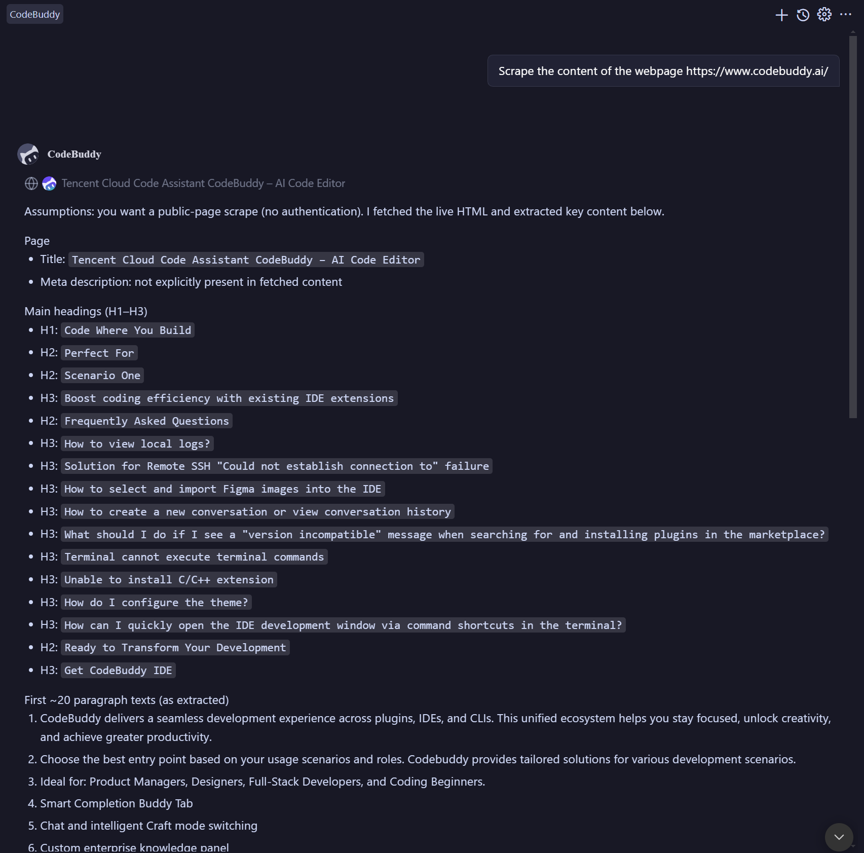 When the model needs to access external network resources, CodeBuddy uses webfetch to retrieve the resources and then provides them to the model, greatly expanding the model's knowledge scope and contextual capabilities.